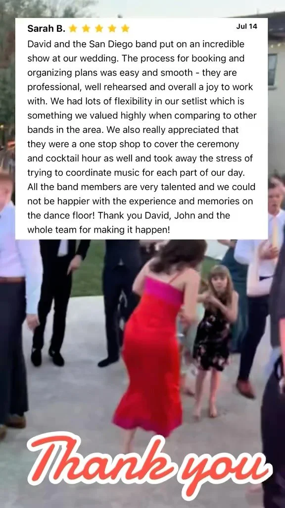 “Incredible quality, communication, professionalism and FUN… The band is incredible!!! ... During the wedding was outstanding, fun, upbeat, everyone was dancing the entire time.”